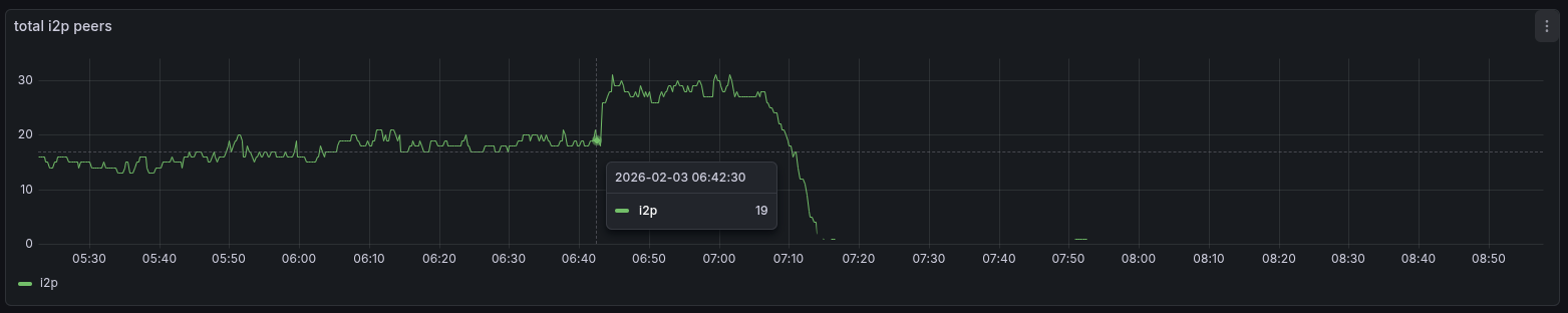 My monitoring indicates it started on 2026-02-03 at around 7 am UTC when all my nodes lost its peers that were connected via I2P. Since then, connectivity seems to have been close to non-existent.