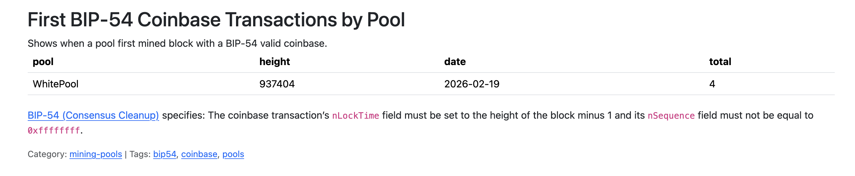Whitepool, a small mining pool, just upgraded their coinbase transactions to be BIP 54 compatible! I think block 937,650 is the first ever BIP54-compatible block.