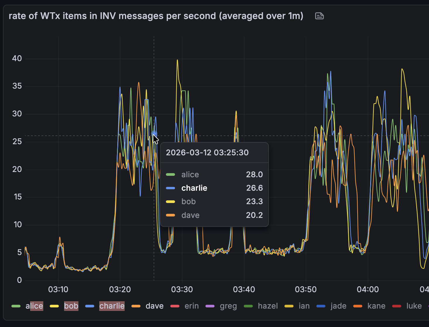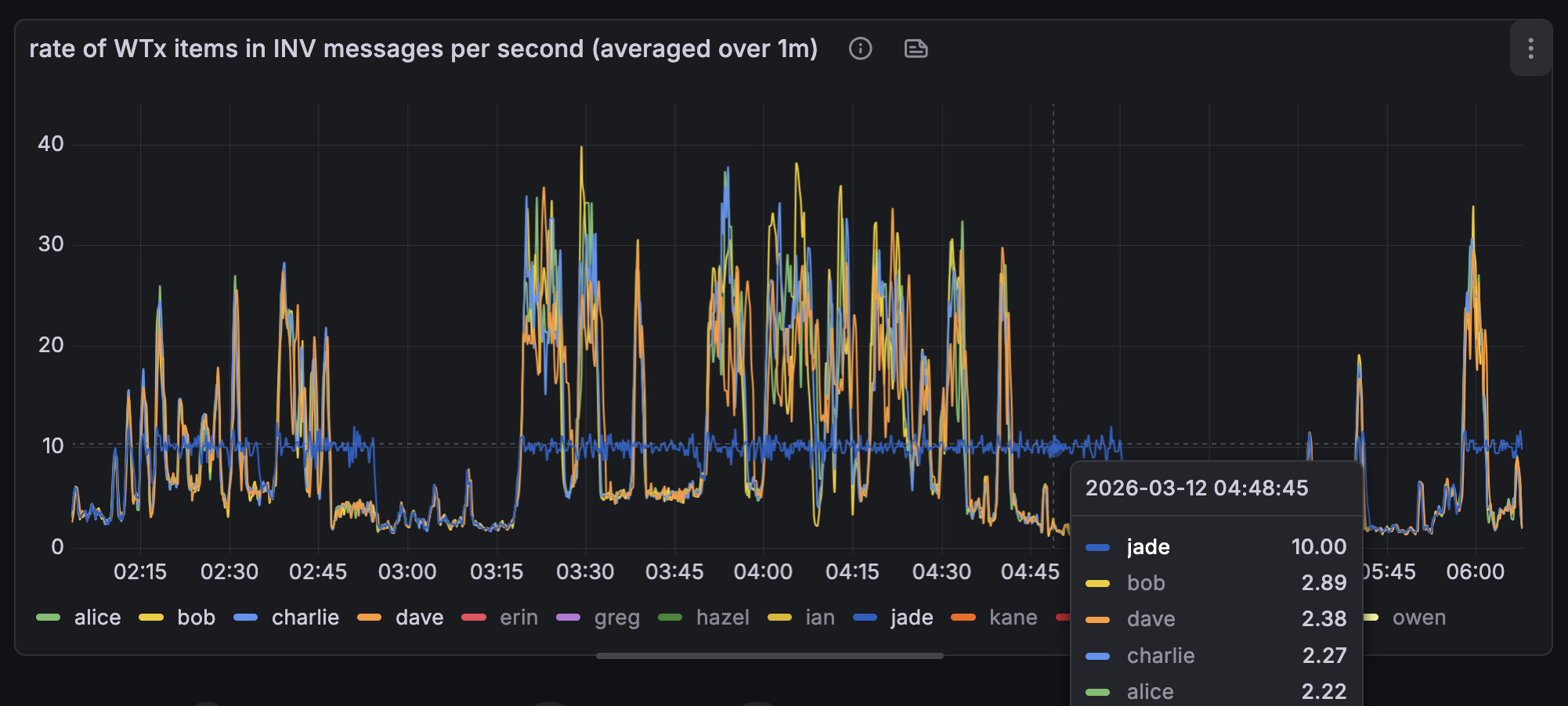 The ârate of WTx over 60sâ graph looks good to me. Interesting that the floor rose (~2tx/s between 3:10 and 3:20 vs 5tx/s between 3:40 and 3:50).