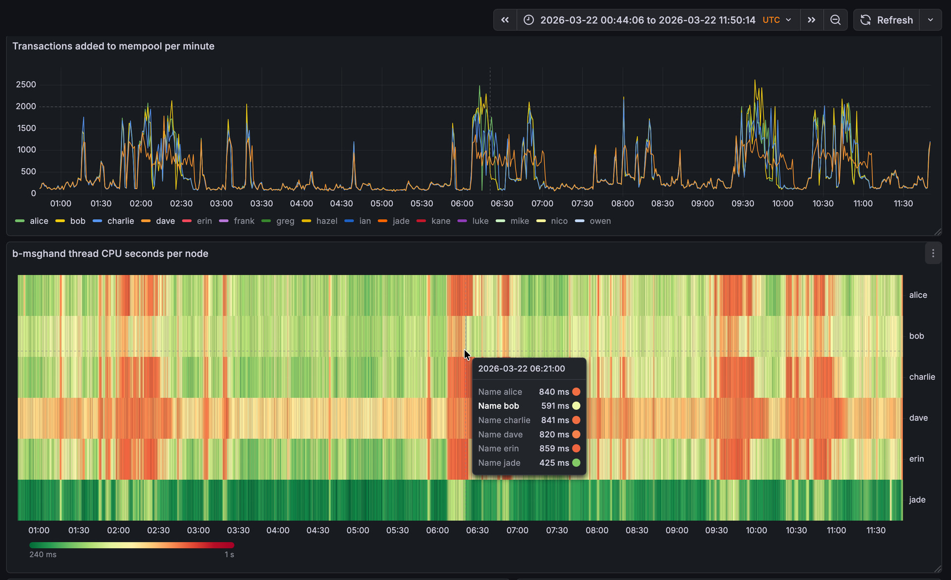 Looking at a recent event, now that the inbound slots on bob have filled up fully, itâs visible that the time we spend in b-msghand is mostly transaction validation, but not transaction propagation anymore. On the other nodes, we have a higher b-msghand utilization for longer, as we first do transaction validation and then the expensive transaction propagation.
