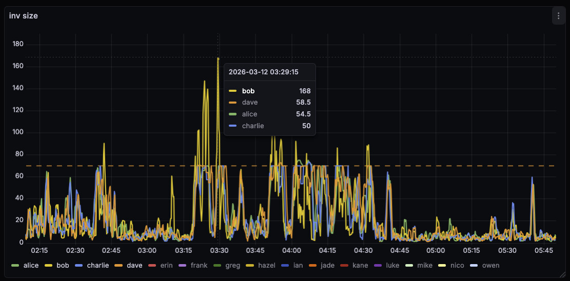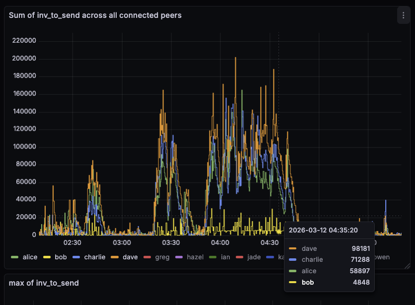 The INVs sent by bob were larger than the ones by the other nodes. With 34628, we fully drain the per-peer queue, so INVs can be larger than before, were we capped it at 70 (unless the queue got large).