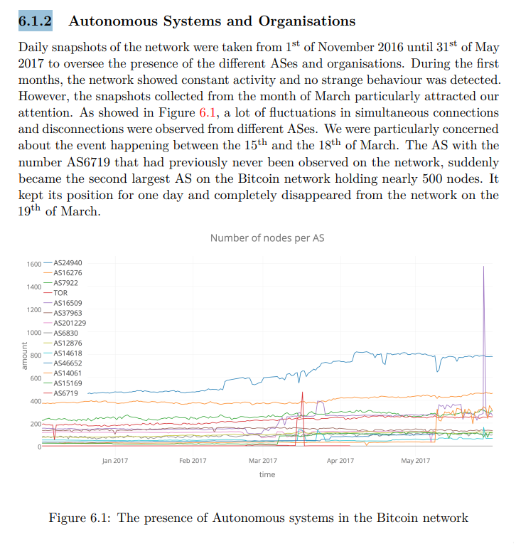 Section 6.1.2. shows monitoring via the Bitnodes data. We could do something similar by integrating DSN and Bitnodes data into peer-observer somehow. I found looking at number of nodes per ASN interesting, because you see quickly if one entity spins up a bunch of nodes.