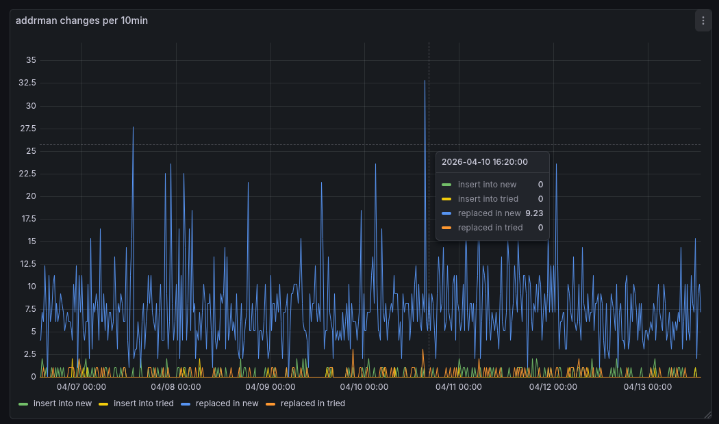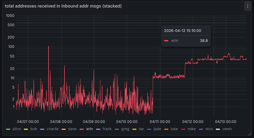 At 2026-04-13T13:47:00Z I received a addr message with exactly 10 entries. All timestamps were recent (not older than 10min). The IPs seemed reasonable from locations where real nodes could be hosted / run from, the ports were mostly 8333, and the services seemed to be reasonable ones too.
