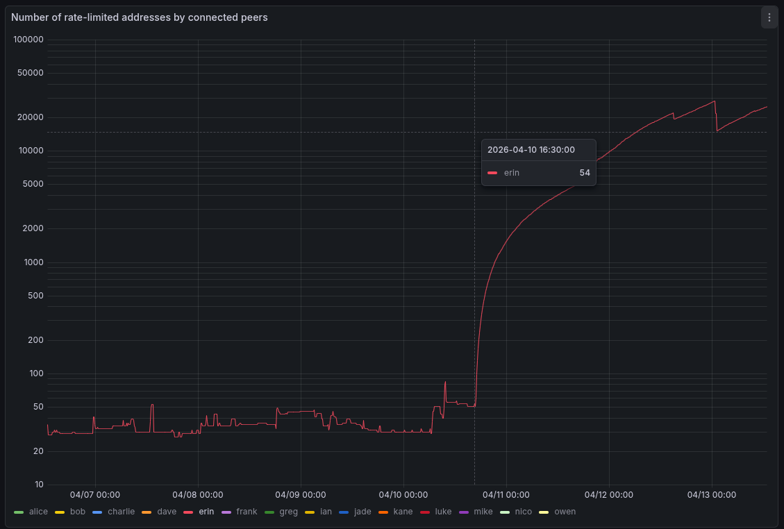 Since 2026-04-10 at about 16:30 UTC I’ve seen multiple IPv4 addresses connect to my monitoring nodes gossiping addresses via addr (and not addrv2) at a higher rate. These addresses are frequently rate-limited.
